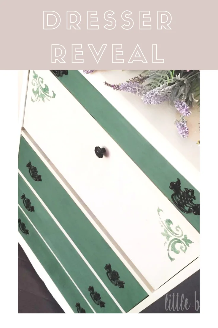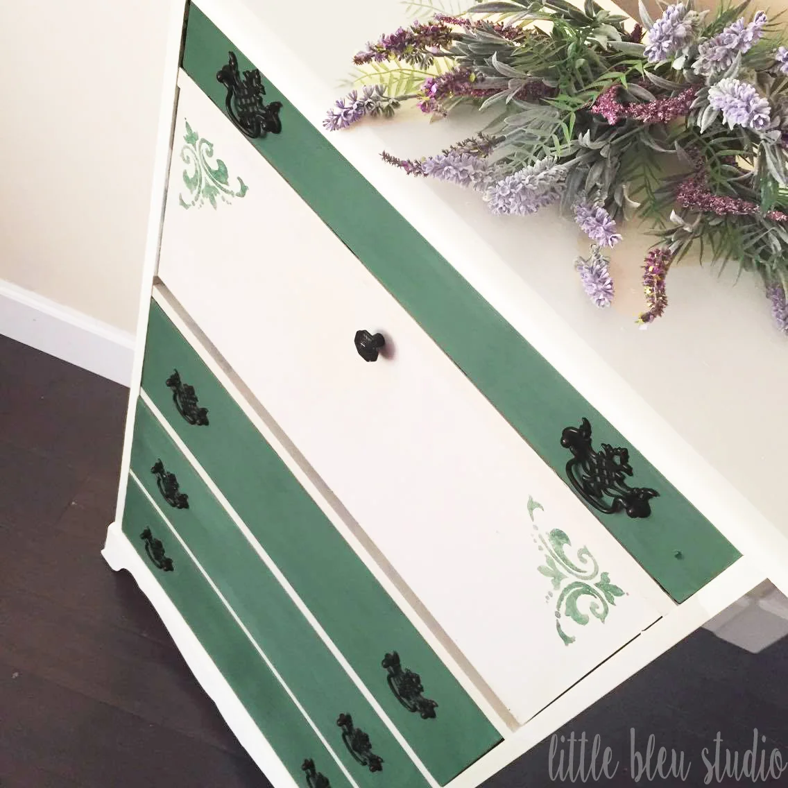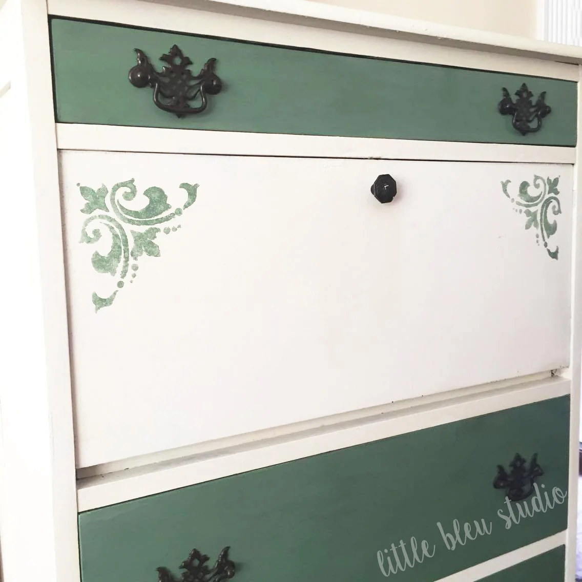 I had some stencils left over from another project, and decided that the little three pointed leaf on these corner scrolls would pair nicely with the three-pointed leaf on the drawer pull, so I added them on! I think at some point I may get a different knob for the door, but for now I'm really happy with how it all turned out!!