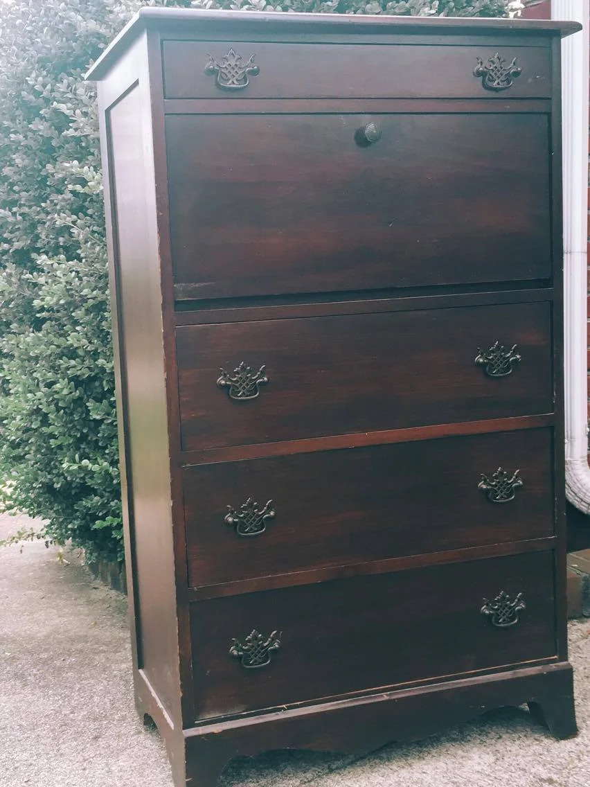 While I was home a few weeks ago, I found this really pretty dresser at The Plucky Peacock! I knew that its narrow width would make it perfect for my small guest room, and that with a few coats of paint it could fit with the French Country style I was wanting.
