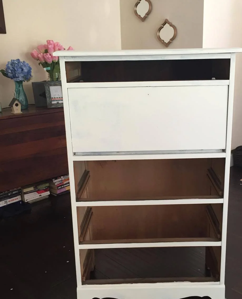 Step 1 was taking all the drawers out so that I could paint the main part of the dresser with Junk Gypsy's Buttermilk Biscuit chalk paint. (Paint was from the Plucky Peacock!)
