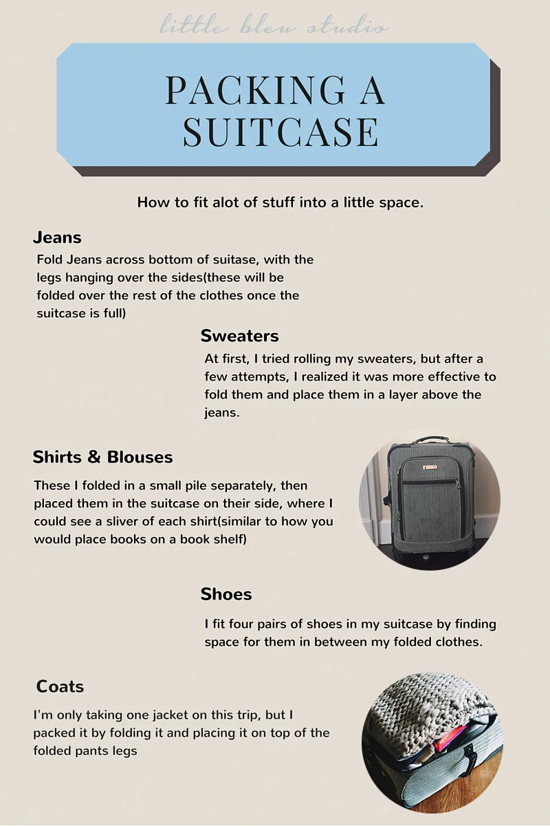 Here are the steps I used to get 5 pairs of pants, 2 sweaters, 12 shirts, and 5 pairs of shoes into my little suitcase! I'll also have a pair of ponte pants in my carry-on, plus the jeans I'm wearing on the flight, so I should be set for the entire trip! I'll be posting pictures soon!