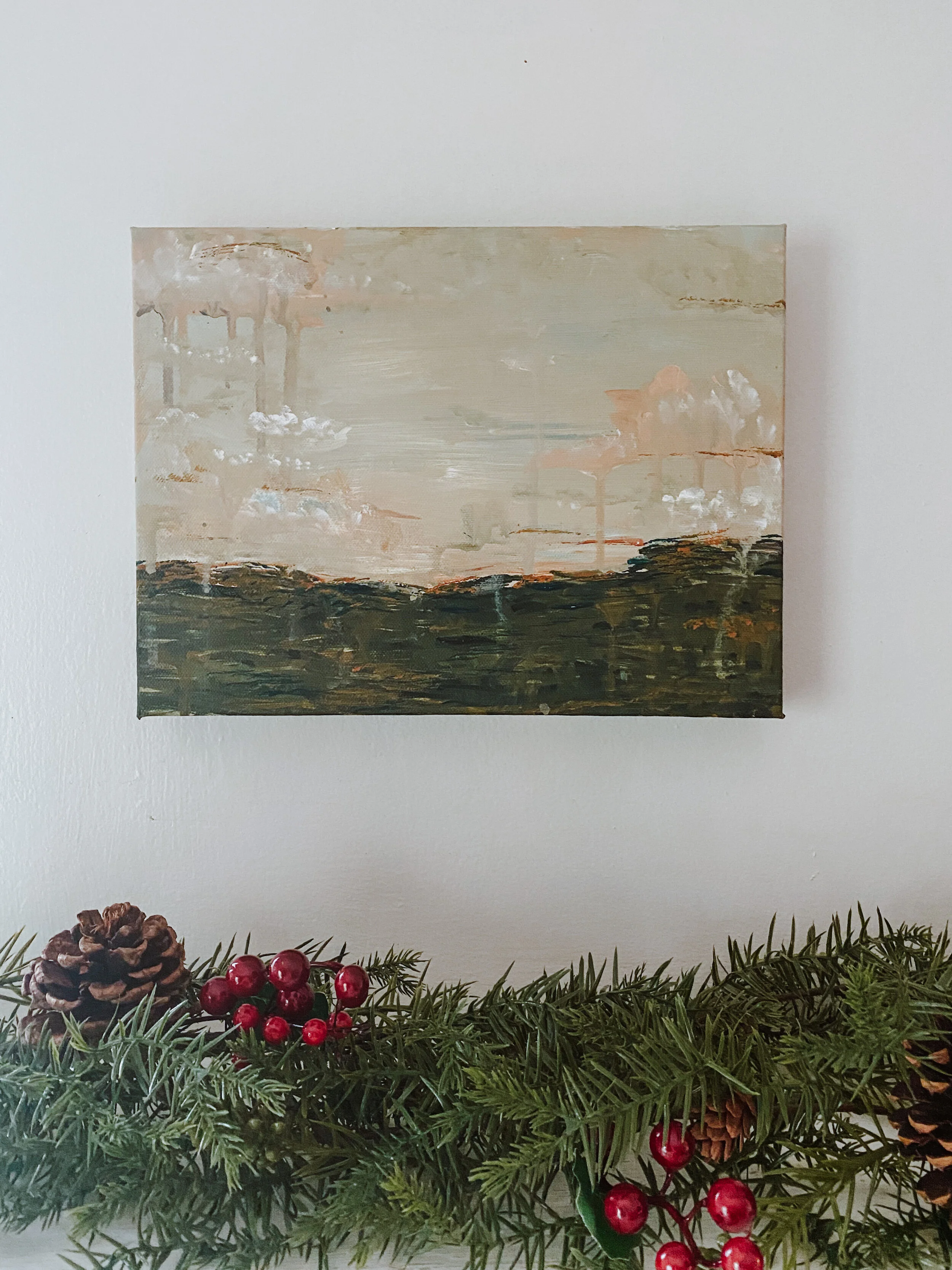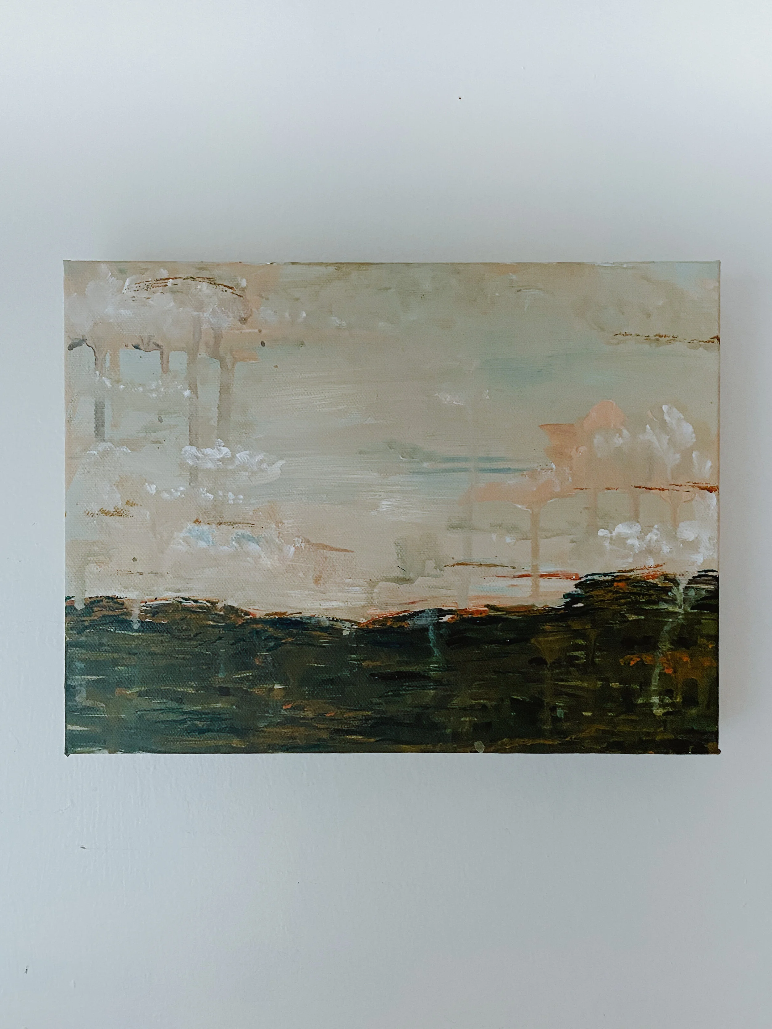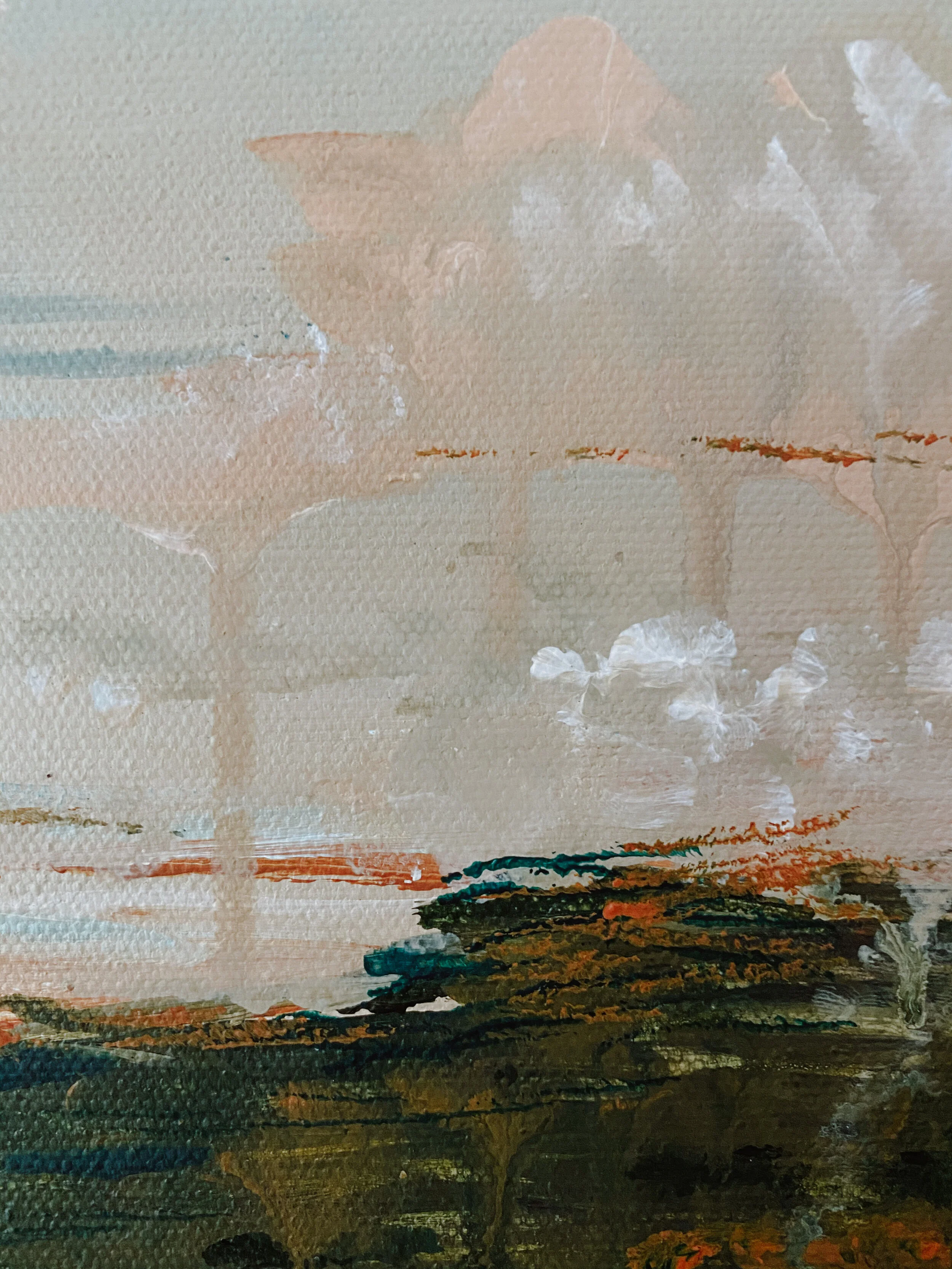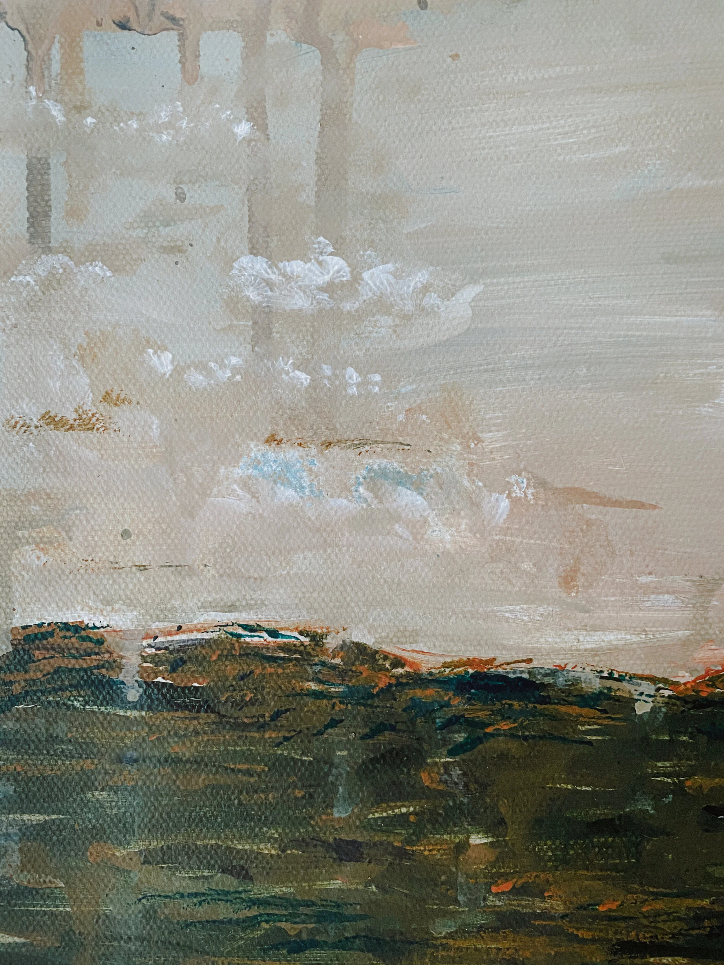 I love Grumbacher’s shade of Raw Sienna, and knew I wanted to create a landscape with it. I mixed it to create warm greens, and hazy cloud drips, and then added the pure color in dips along the horizon.
